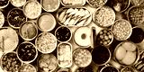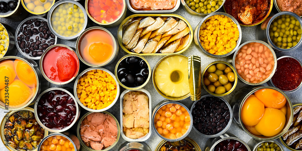 A large set of pickled and canned foods on the background. Metal cans with canned vegetables, beans, fish, seafood and fruit. Top view.