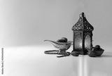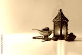 Ramadan food and drinks concept. Ramadan Lantern with arabian lamp, wood rosary, dates fruit and lighting on white background