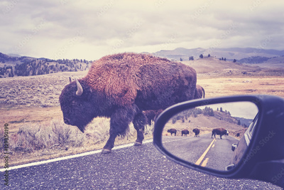 Retro toned photo of American bison (Bison bison) on a road seen from car driver seat in Grand Teton National Park, Wyoming, USA.