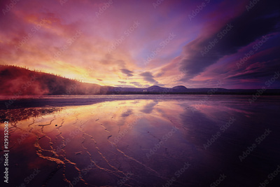 Intense sunset at Grand Prismatic Spring in Yellowstone National Park, Wyoming, USA.