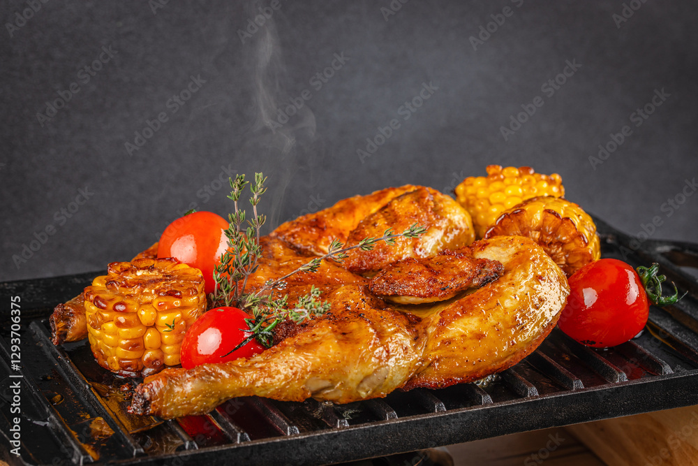 Grilled fried roast Chicken Tobacco on grill. Georgian dish on a dark background. copy space