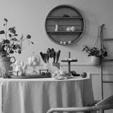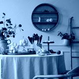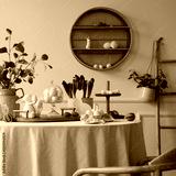 Warm and spring dining room interior with easter accessories, shelf on wall, round table, vase with green leaves, colorful eggs, rabbit sculpture and personal accessories. Home decor. Template.