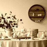 Warm and spring dining room interior with easter accessories, round table, vase with green leaves, cake, colorful eggs, rabbit sculpture and personal accessories. Home decor. Template.