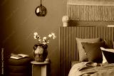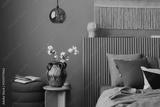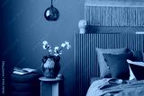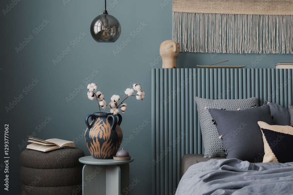 Serene bedroom with a sculptural vase on a side table, soft blue bedding, and a woven tapestry adding texture and warmth.