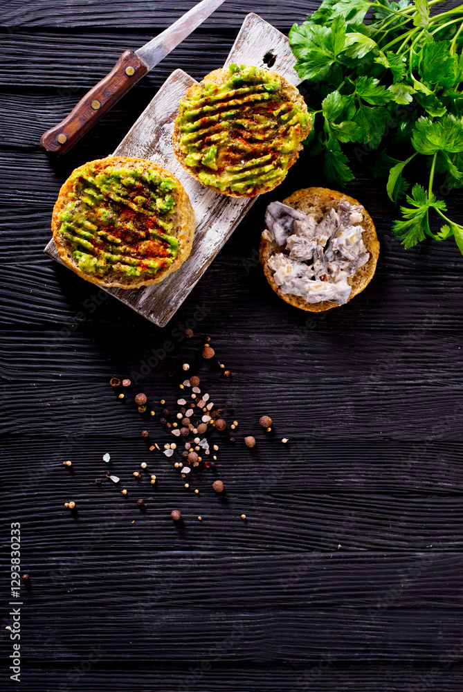 Fresh sandwich with avocado and herbs and seeds