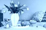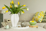Easter-inspired home decor with yellow tulips, a whimsical ceramic chicken, and pastel-colored eggs in a vintage-style green bowl. A neutral background enhances the vibrant seasonal details.