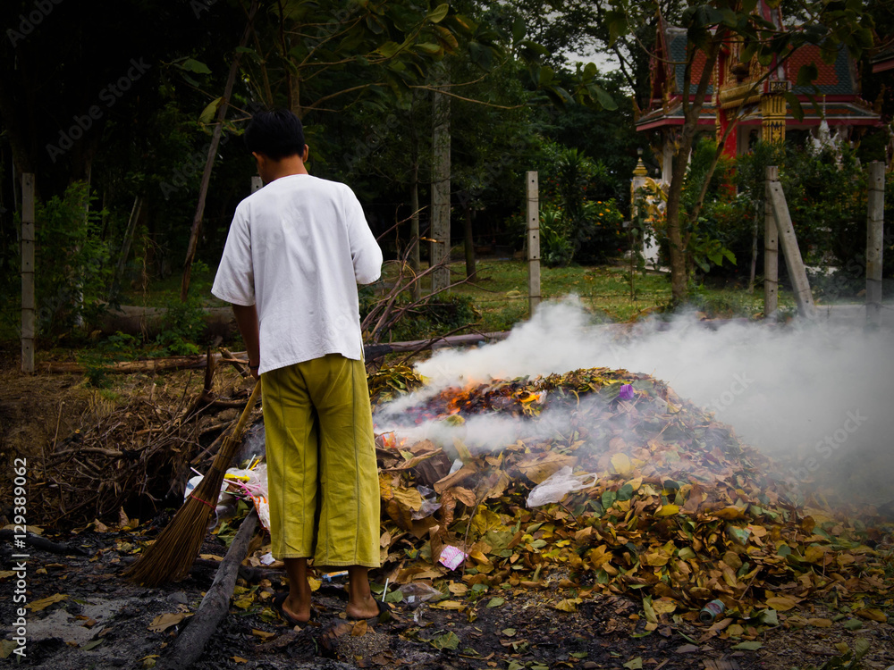 Sweepers garbage waste Incineration with smoke.