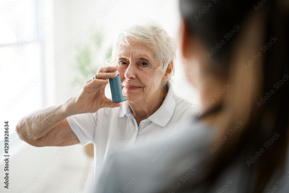 Elderly woman using inhaler for asthma and respiratory diseases at home