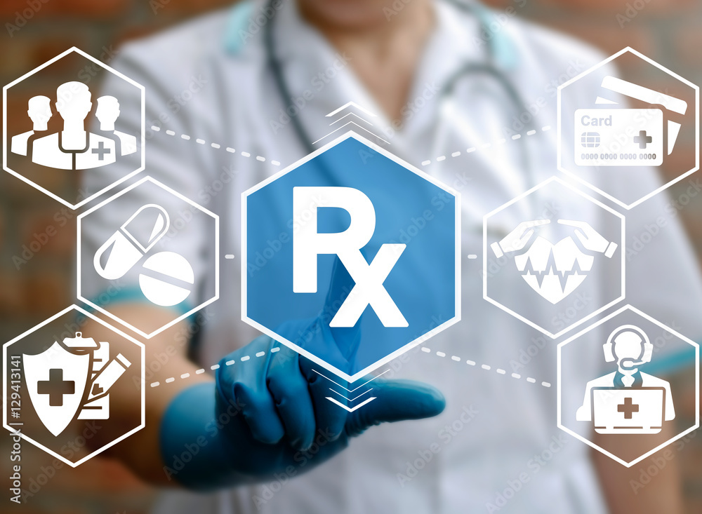 Medicine, healthcare concept - doctor presses rx icon. Drug treatment health insurance medical network icon.