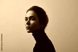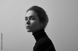 Dramatic black and white portrait of young beautiful girl with freckles in a black turtleneck on white background in studio