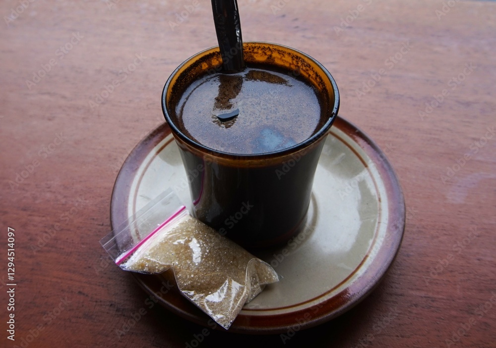 black coffee with sugar in plastic, hot black coffee is perfect to enjoy in the morning