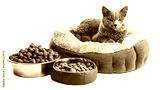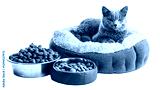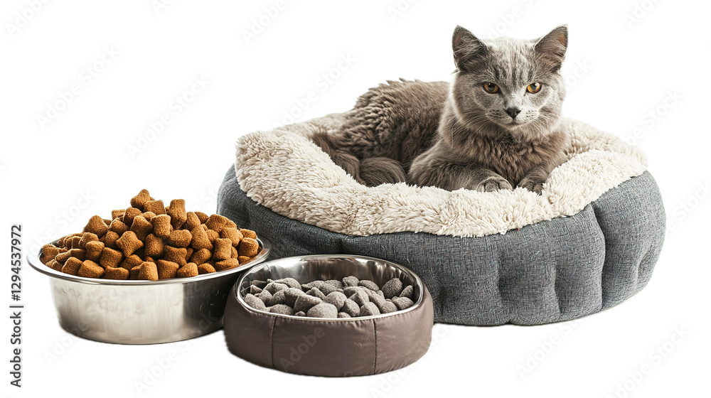 Cozy cat resting in a plush bed with food bowls indoor home environment pet photography comfort zone feline lifestyle