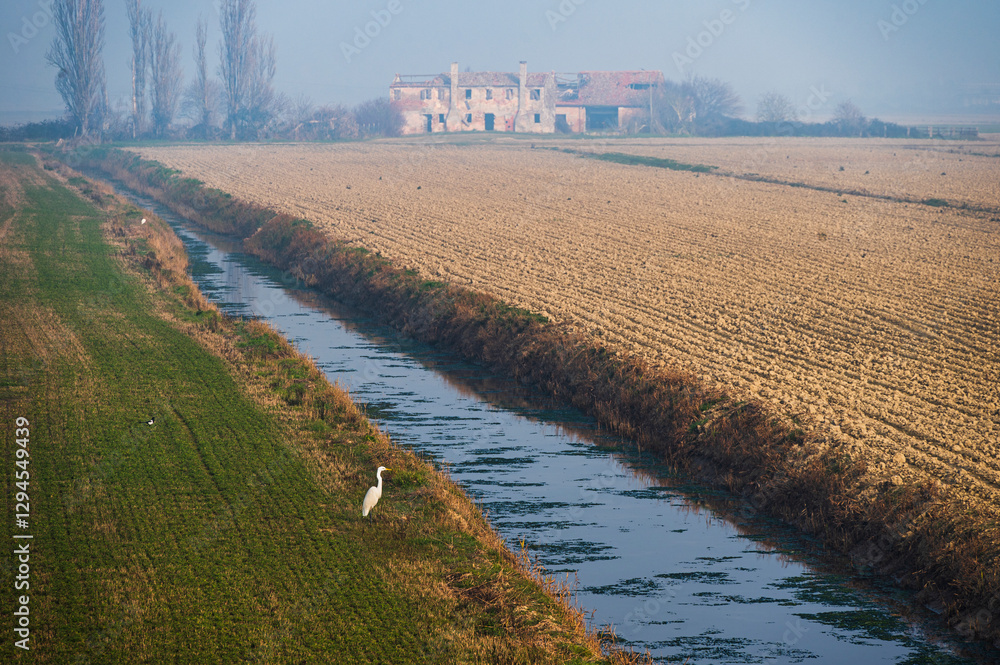 the river Po inside its Veneto side Delta during a winter season, Rovigo, Italy