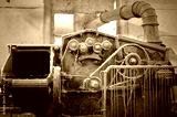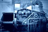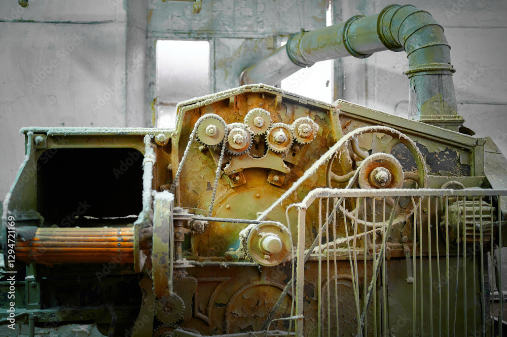 Intricate details of ancient textile machinery featuring gears, belts, and pipes in an abandoned workshop environment