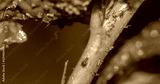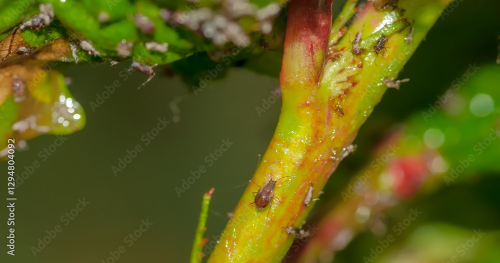 Mszyce w akcji - owady żerujące na pędach roślin i żywiące się sokami roślinnymi. Gromada mszyc na zielonym pędzie rośliny, prezentująca swoje małe, owalne ciała. Owady żerują skupione .
