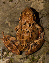 The common frog or grass frog (Rana temporaria). A reptile in a stream in the Balkan forest.