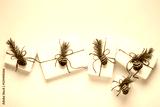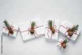 Modern gifts on a white wooden table with copy space. Christmas background. View from above. Flat lay