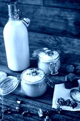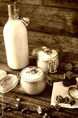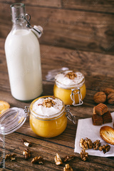 Pumpkin milkshake in glass jar with whipped cream, toffee, walnut and honey cookies. Bottle of milk. Dark wooden background. selective focus.