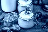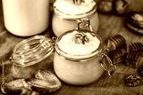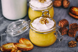Pumpkin milkshake in glass jar with whipped cream, toffee, walnut and honey cookies. Bottle of milk. Gray napkin. background. selective focus.