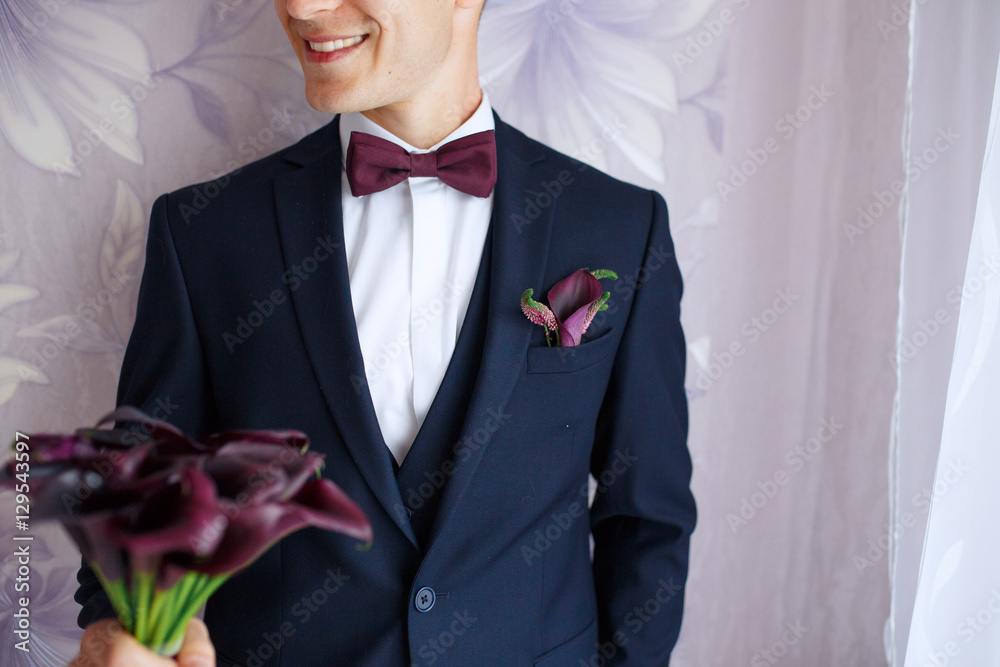 Gorgeous smiling groom. Handsome groom at wedding tuxedo smiling and waiting for bride.Elegant man in black costume and bow-tie.