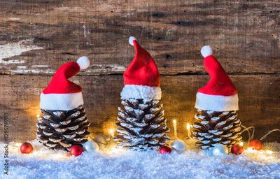 Weihnachtskarte Grußkarte mit Nikolaus Mütze auf Zapfen im Schnee