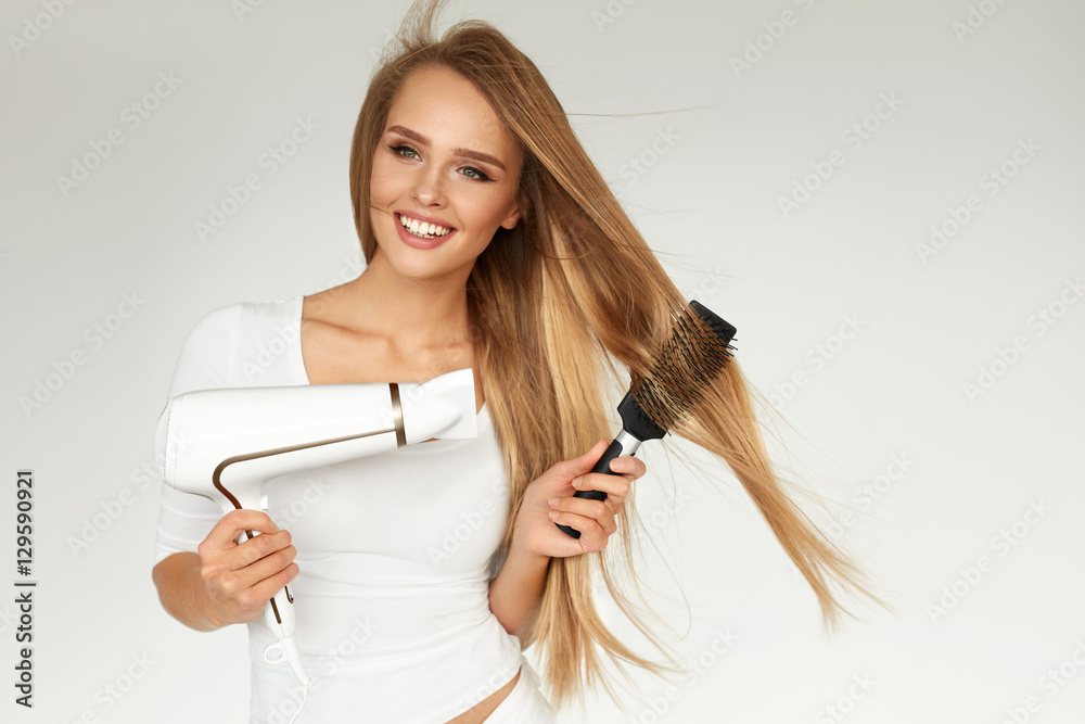 Hair Care. Woman Drying Beautiful Long Hair Using Dryer