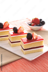 Sweet and colorful layered cakes with a glossy red topping, fresh strawberries, and blackberries. The soft sponge, creamy layers, and fruity flavors make it a tasty dessert.