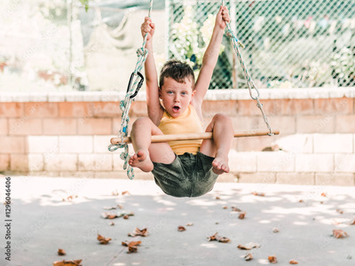 Joyful child swinging enthusiastically on a sunny day outdoors