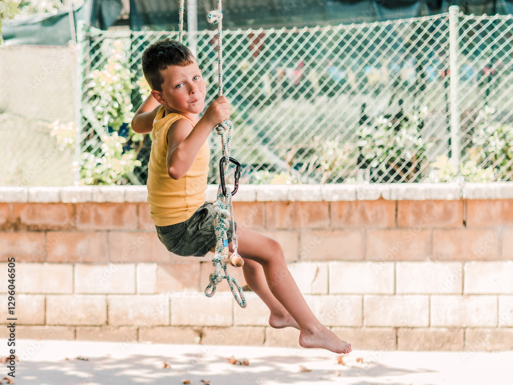 Joyful boy swinging on a sunny day in a cheerful outdoor setting