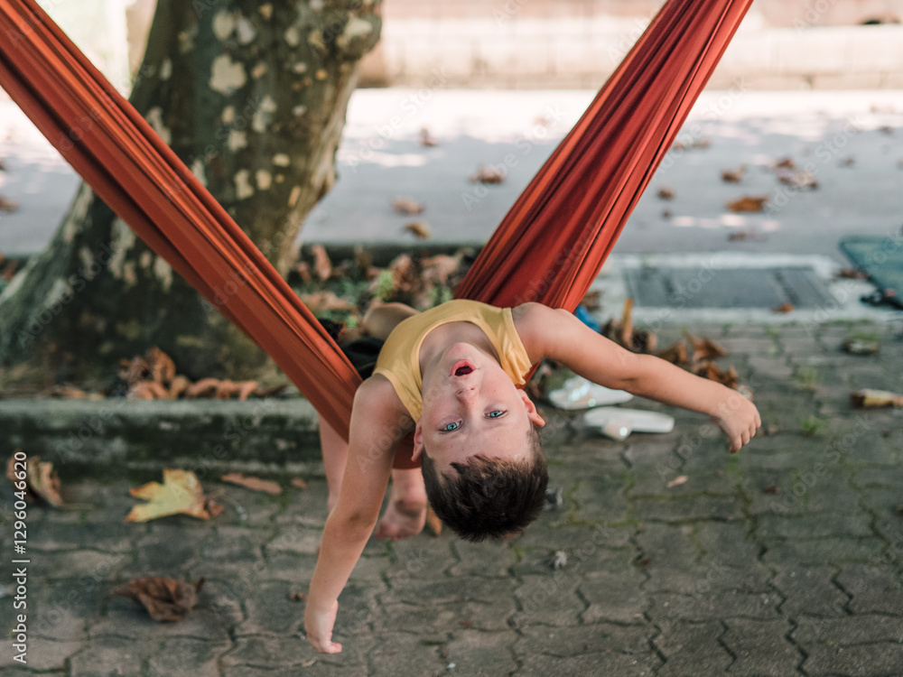 Young boy joyfully hanging upside down in a vibrant hammock outdoors