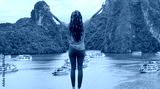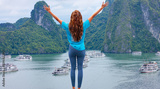 Happy slim girl in grey tights and blue t-shirt with raised up arms on while Boat cruise to Ha Long Bay - Sunset In The Morning On The harbour In Ha long Bay In Vietnam