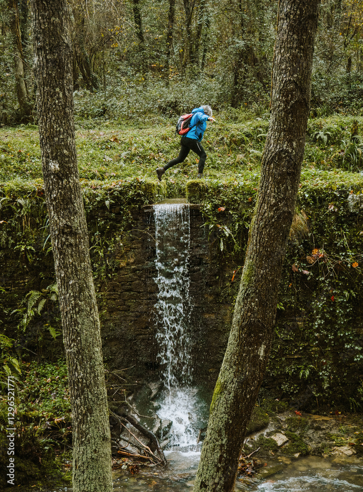 Hiker joyfully leaps over a quaint waterfall in lush forest surroundings