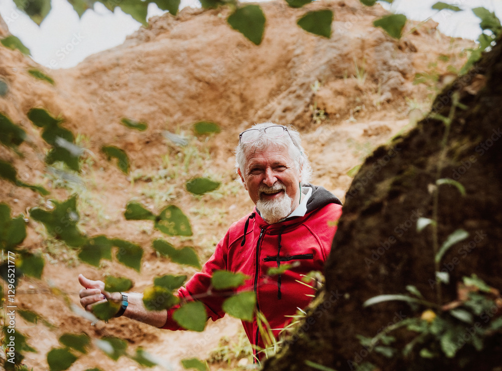 Joyful exploration in nature with a smiling elderly man