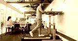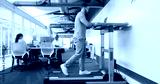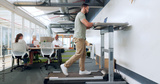Man, walking and treadmill with a businessman in the breakroom of his office for exercise or mobility. Fitness, health or corporate with a male employee in staying active in the workplace