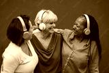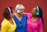 Happy multiracial senior women listening music with wireless headphones in the city - Trendy elderly people enjoy day outdoor