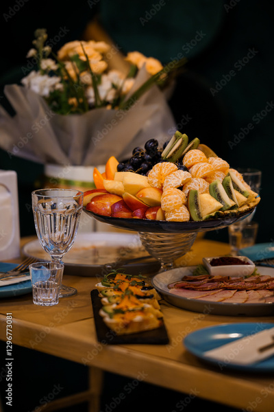 Vibrant Fruit and Culinary Delight Display at an Elegant Table Setting