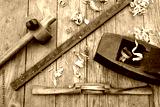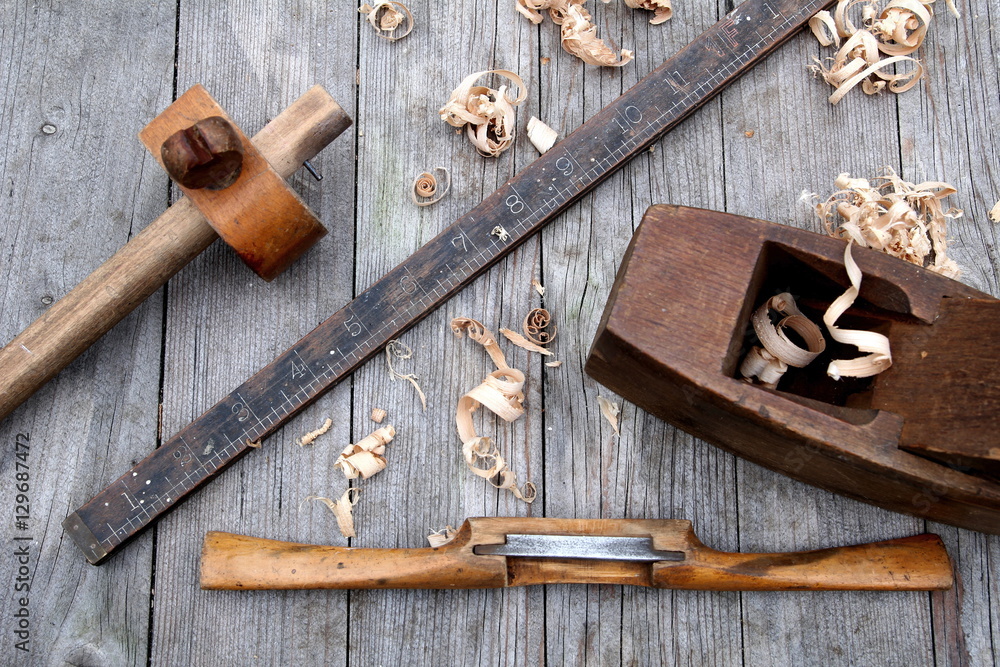 Antique vintage ruler, spokeshave, mortise gauge and block plane