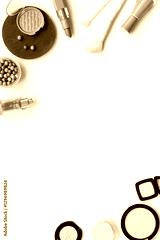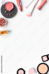 Makeup cosmetic products in brown pink shades - powder, blush and lipstick with perfume, top view
