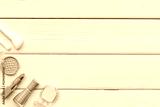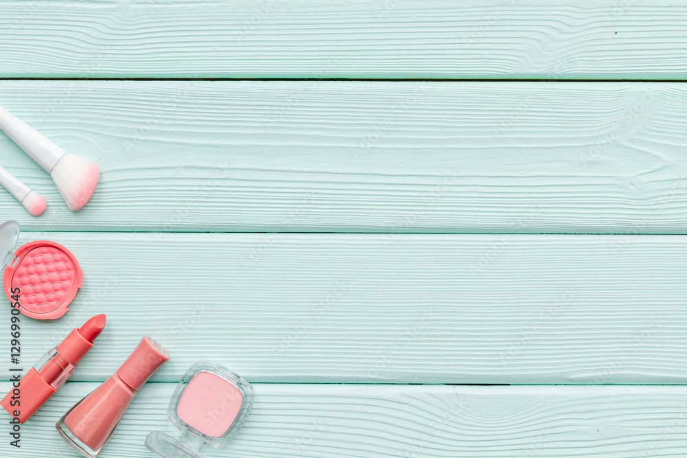 Makeup cosmetic products in brown pink shades - powder, blush and lipstick with perfume, top view