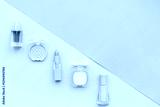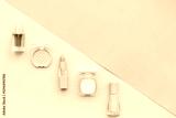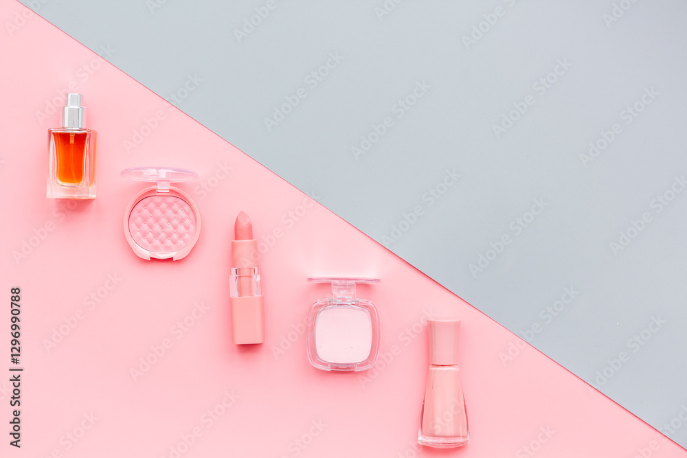 Makeup cosmetic products in brown pink shades - powder, blush and lipstick with perfume, top view
