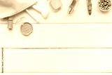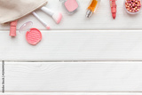 Layout of makeup cosmetic and brown pink shade beauty products, top view