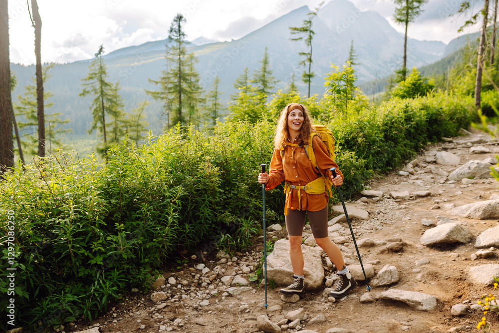 Female hiker with hiking backpack and trekking poles climbing rocky path with mountains in background. Sporty woman enjoying view on sunny day. Hiking concept. Active lifestyle.