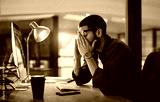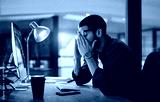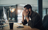 Computer, eye strain and headache with man in office for website coding or programming deadline. Burnout, fatigue and stress with frustrated programmer employee in creative workplace for overtime