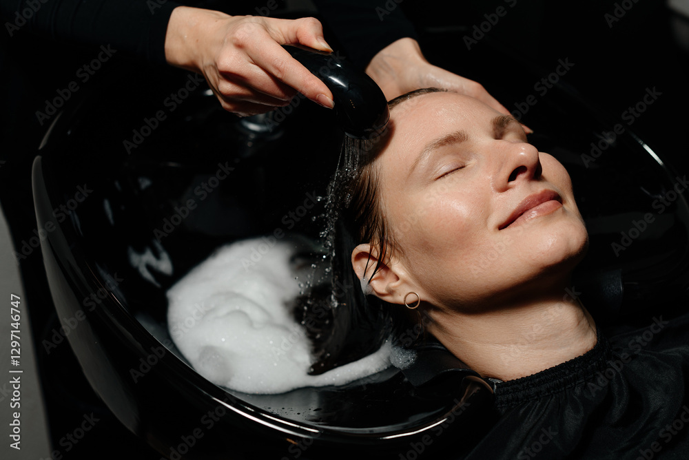 hairdresser washing client hair with water and foaming shampoo in black basin in beauty salon, massaging head, young beautiful caucasian woman getting hair washed, treatment and relax