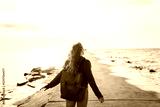 Cute woman with backpack enjoying sunset light on lighthouse, feeling freedom. Tourist relaxing in nature, walking along embankment. Concept of walking, traveling, freedom. Lifestyle.