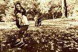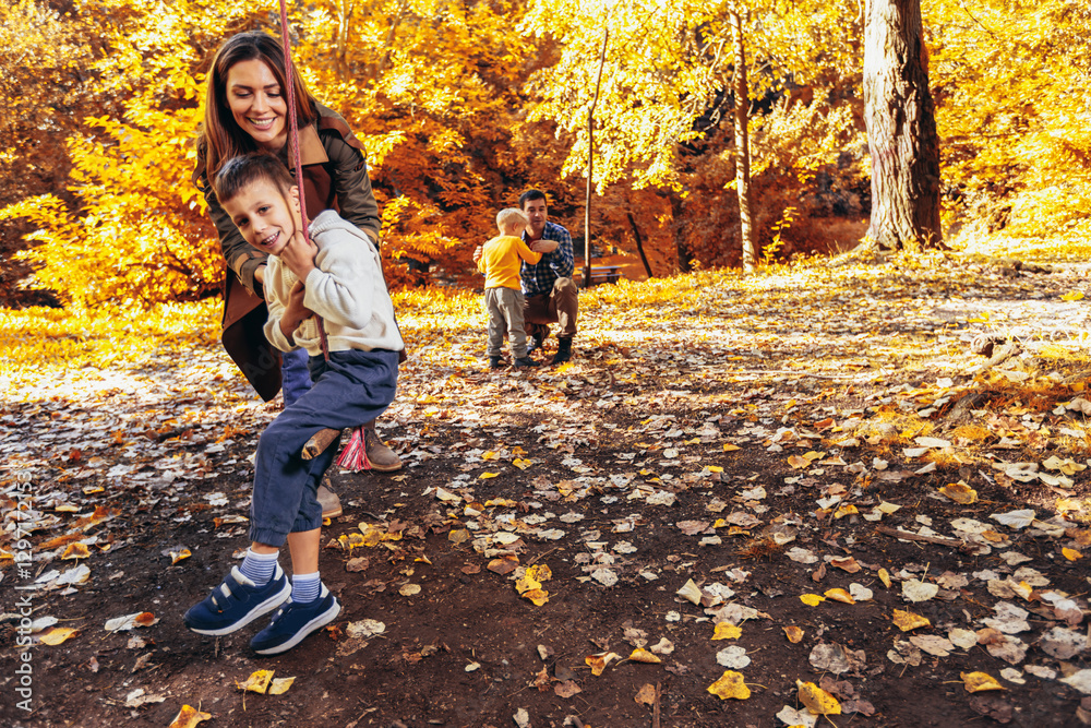 Happy family having fun on a swing ride in the autumn park.