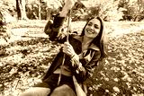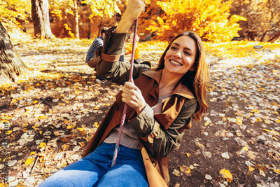Happy family having fun on a swing ride in the autumn park.