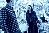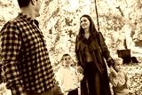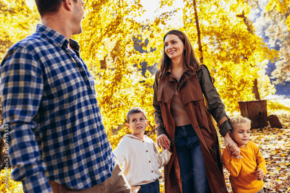 Happy family with two young sons enjoying a cozy autumn picnic in the park.