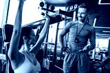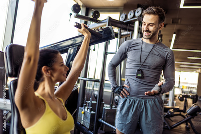 Young fit woman trains shoulders and arms on a machine in the gym while her personal trainer is helping her.
