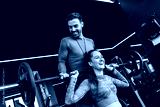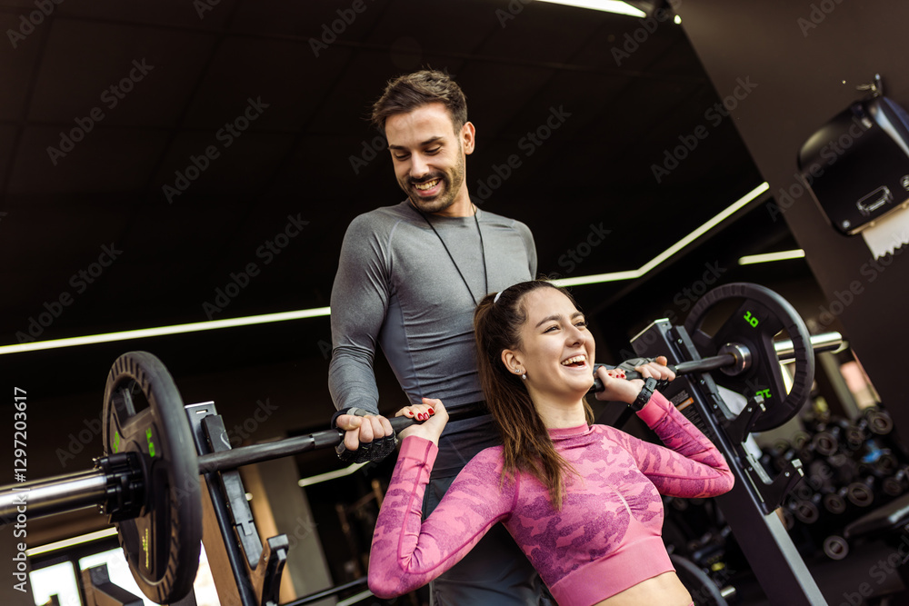 Young woman does shoulder press with weights in the gym while her personal trainer is spotting her.